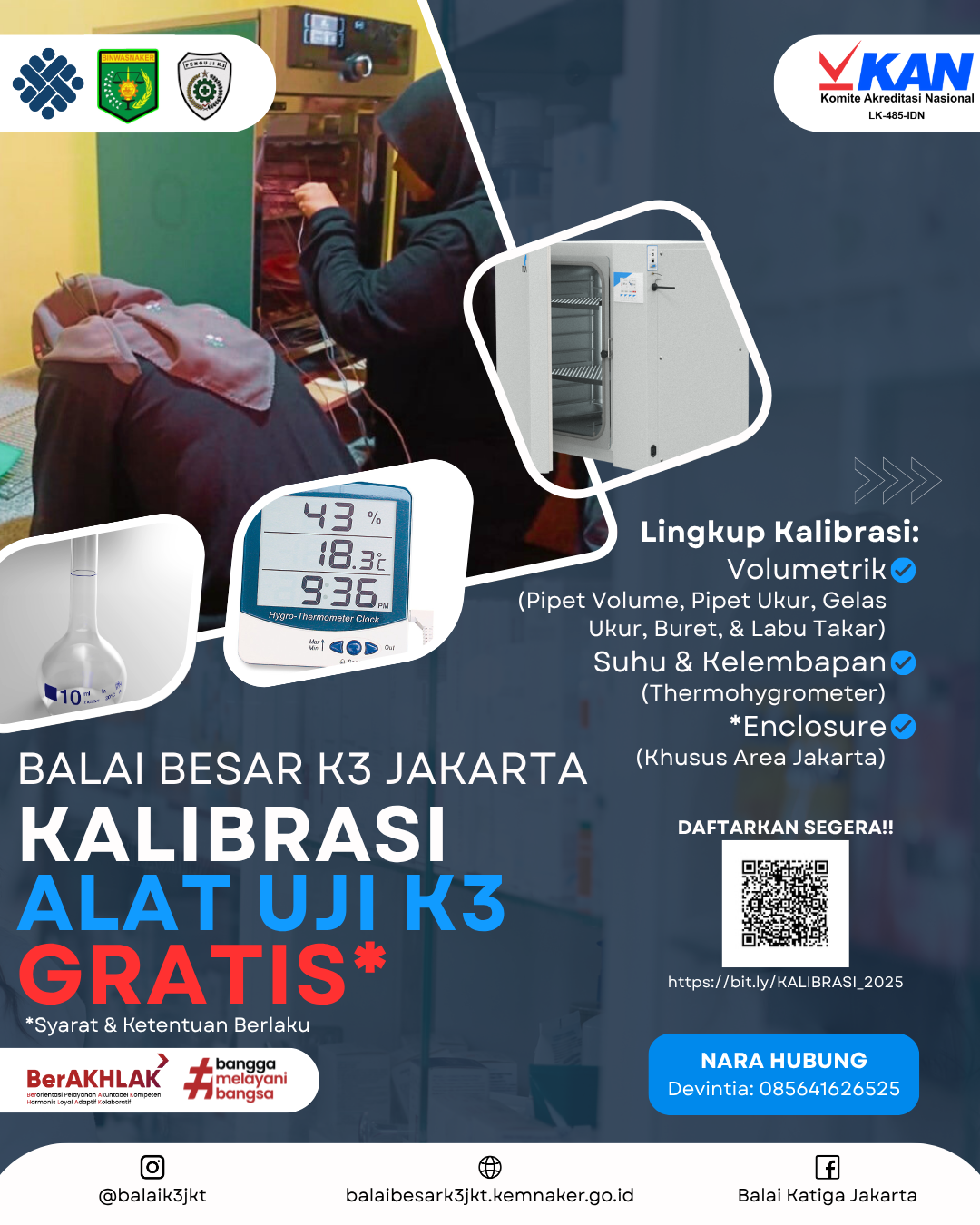 Balai Besar K3 Jakarta menawarkan jasa kalibrasi alat uji seperti glassware, oven, chiller dan alat ukur suhu dan kelembaban. Seluruh layanan kalibrasi yang disediakan telah terakreditasi oleh Komite Akreditasi Nasional (KAN) sesuai dengan standar ISO/IEC 17025, sehingga menjamin keakuratan dan keandalan hasil pengukuran.Bagi yang berminat, silahkan mendaftar di tautan https://bit.ly/KALIBRASI_2025 Read More
