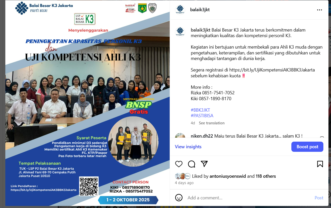 Bimbingan Teknis dan Uji Kompetensi Personil Ahli K3 Umum October, 16 2025 Uji Kompetensi Personil K3 Bimbingan Teknis dan Uji Kompetensi Personil Ahli K3 Umum Read More